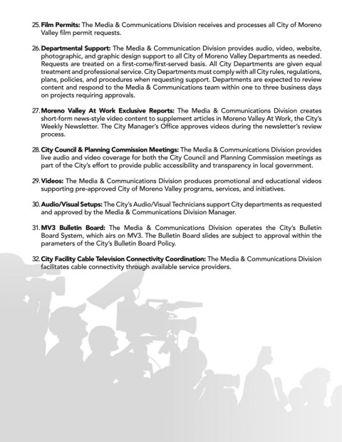 25.Film Permits: The Media & Communications Division receives and processes all City of Moreno