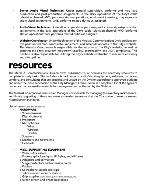 assignments in the daily operations of the City’s cable television channel, MV3; performs